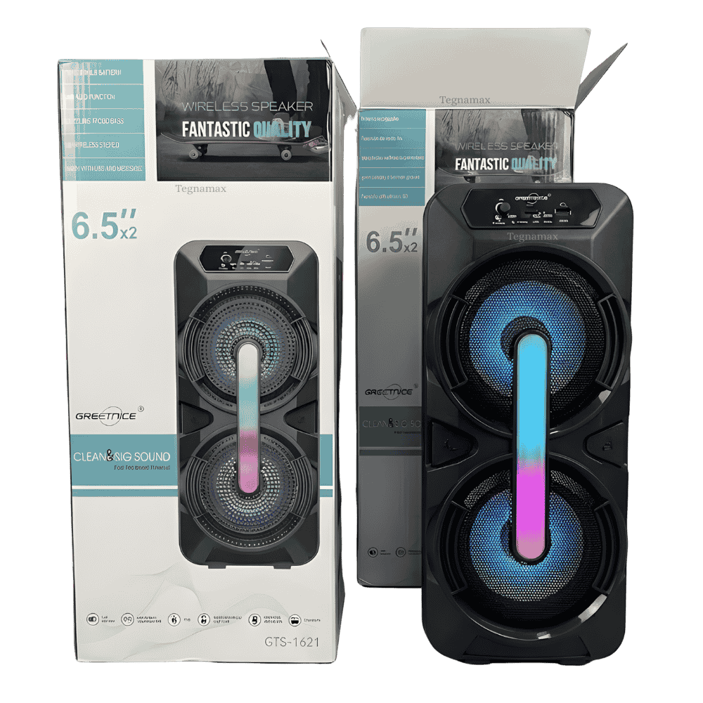 ¿Buscas un equipo de sonido que sea potente pero fácil de transportar? Entonces, este parlante bluetooth doble 6.5 pulgadas es la elección perfecta para tus reuniones. De hecho, los parlantes pequeños a veces no tienen suficiente bajo. Por lo tanto, este modelo con doble woofer ofrece graves profundos y un volumen alto para llenar una sala o patio.