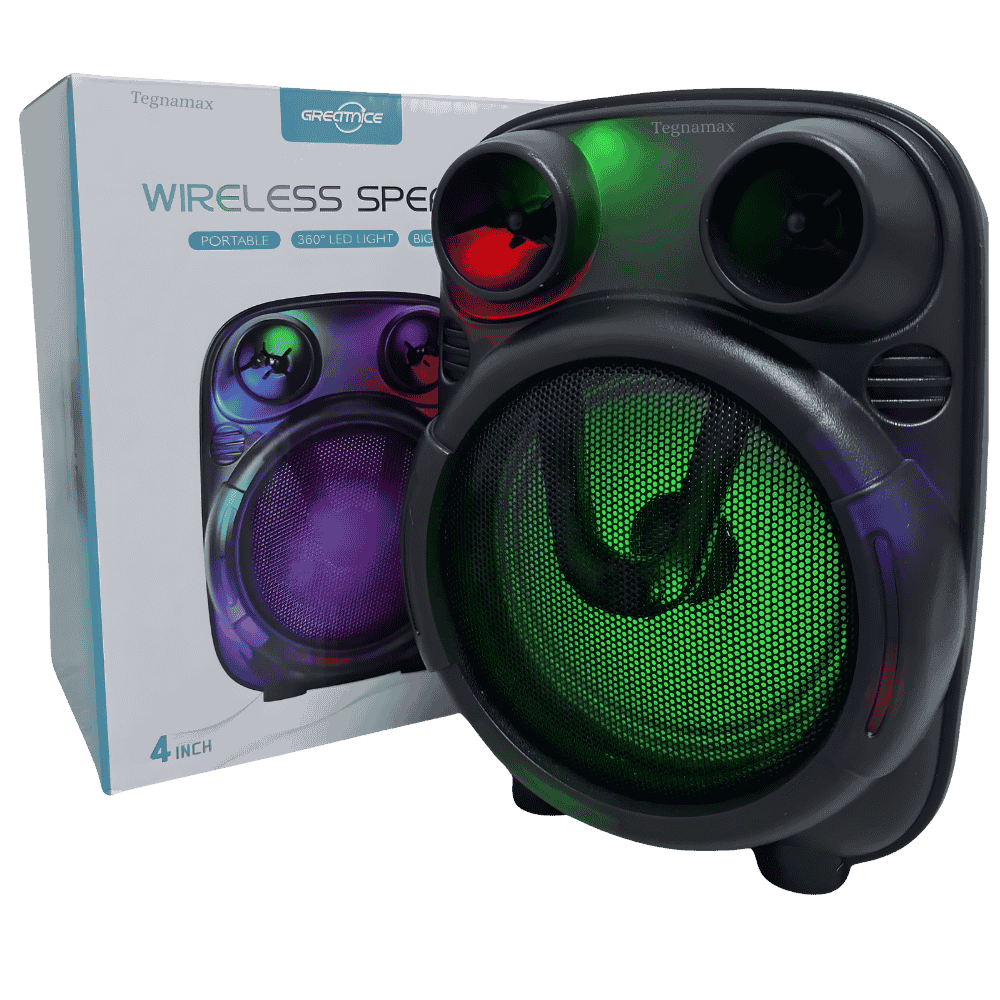 Su bocina de 4 pulgadas (aprox. 10 cm) ofrece un equilibrio perfecto entre bajos y agudos, con una potencia aproximada de 5W a 10W, suficiente para llenar una habitación. Lo más llamativo es su espectáculo de luces: cuenta con iluminación LED multicolor detrás de la rejilla que brilla dinámicamente, dándole un toque moderno y divertido a tu espacio.